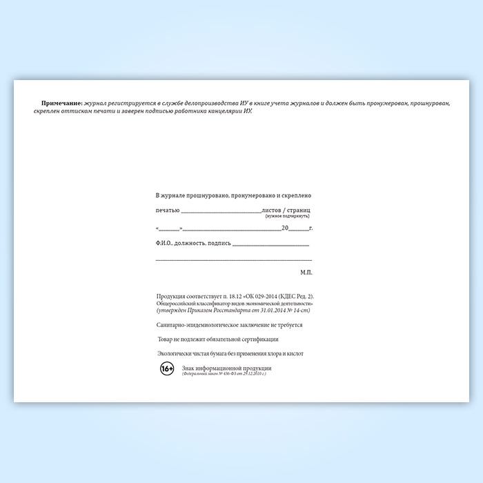Журнал регистрируется в службе делопроизводства ИУ в книге учета журналов и должен быть пронумерован, прошнурован, скреплен оттиском печати и заверен подписью работника канцелярии ИУ.