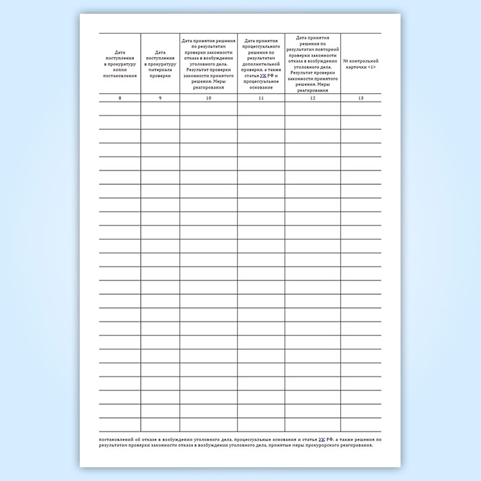 Для учета поступивших в прокуратуру копий постановлений и материалов об отказе в возбуждении уголовных дел ведется книга, в которой фиксируют решения, принятые в ходе осуществления надзорных полномочий.