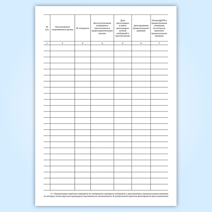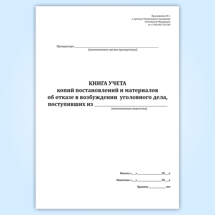 Форма книги соответствует Приложению 1 к Приказу Генпрокуратуры России от 17.09.2021 N 544 "Об организации прокурорского надзора за процессуальной деятельностью органов предварительного следствия"