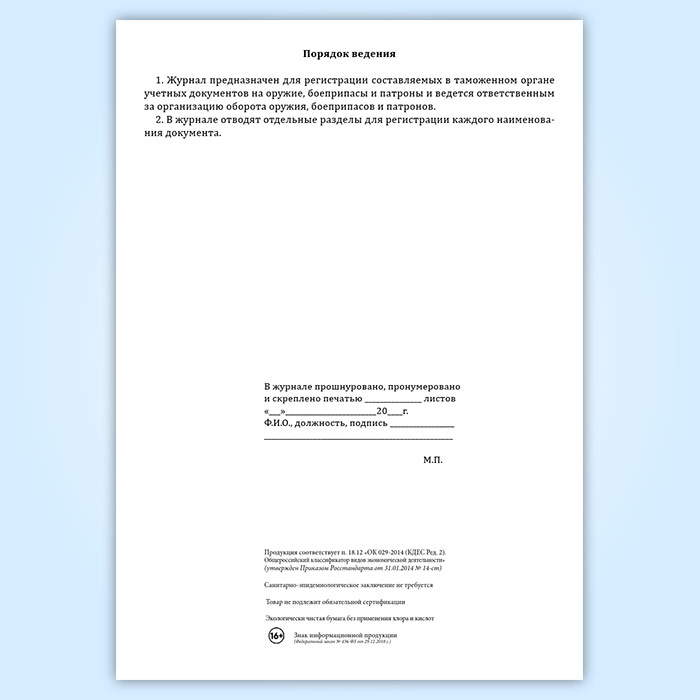Журнал предназначен для регистрации составляемых в таможенном органе учетных документов на оружие, боеприпасы и патроны и ведется ответственным за организацию оборота оружия, боеприпасов и патронов.