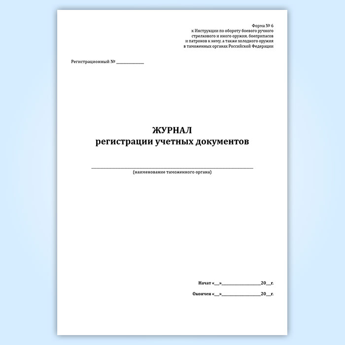 Форма Журнала регистрации учетных документов соответствует Приложению к Инструкции по обороту боевого ручного стрелкового и иного оружия, боеприпасов и патронов к нему, а также холодного оружия в таможенных органах Российской Федерации.