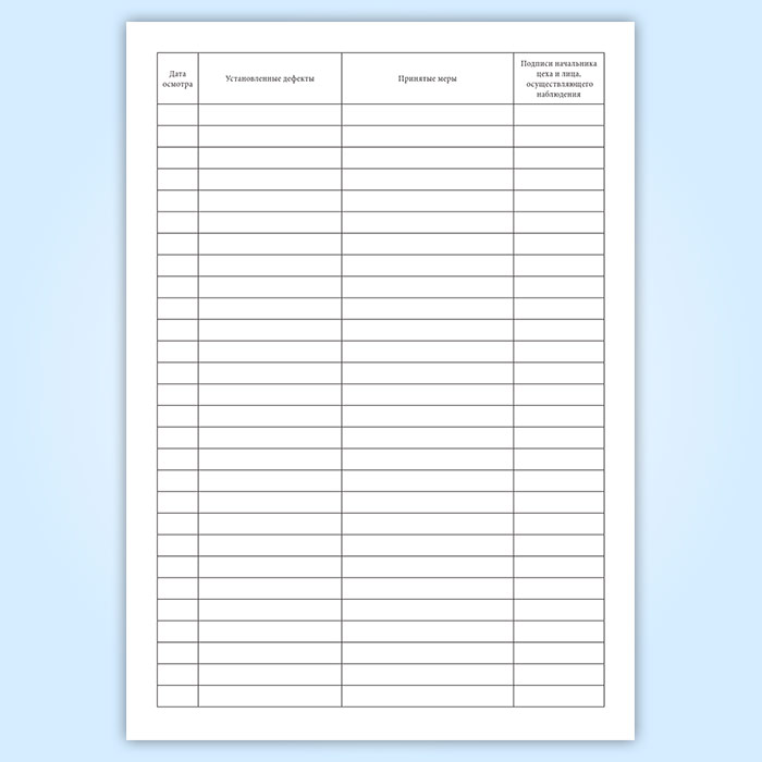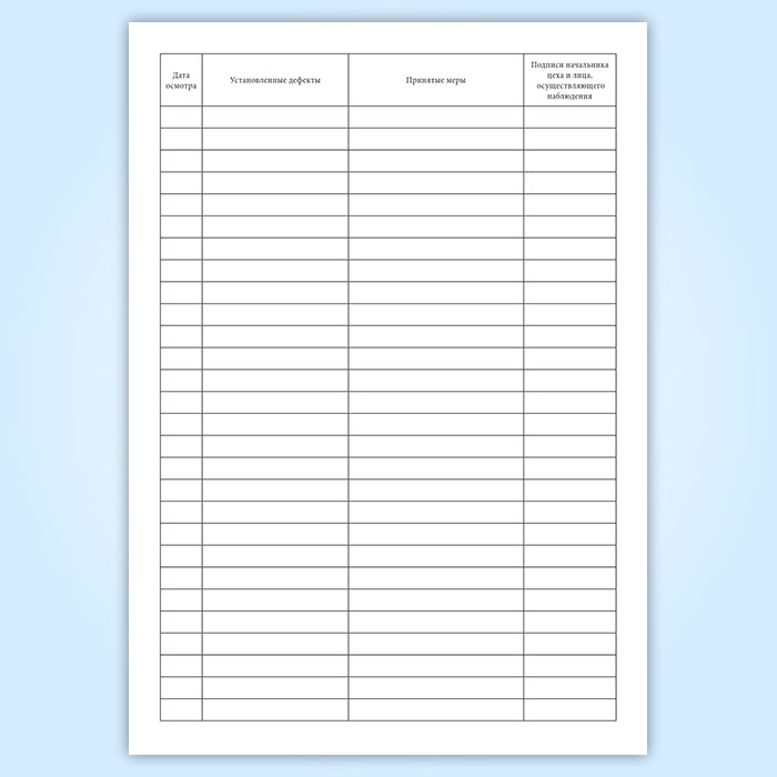 Форма журнала осмотра градирни соответствует Приложению 2 к "Типовой инструкции по приемке и эксплуатации башенных градирен. РД 34.22.402-94" , утвержденной РАО " ЕЭС России" от 23.12.1994 года.