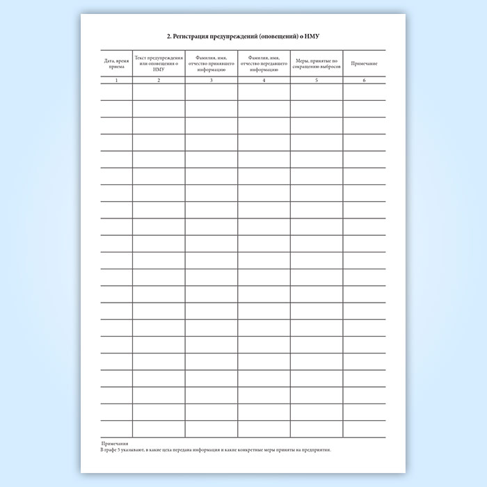 Журнал регулирования выбросов при неблагоприятных метеорологических условиях (НМУ) имеет графы: