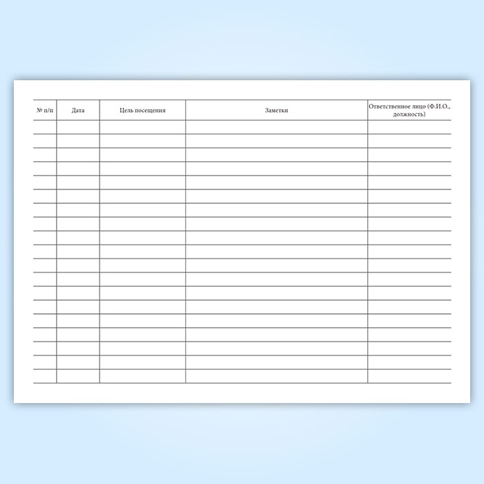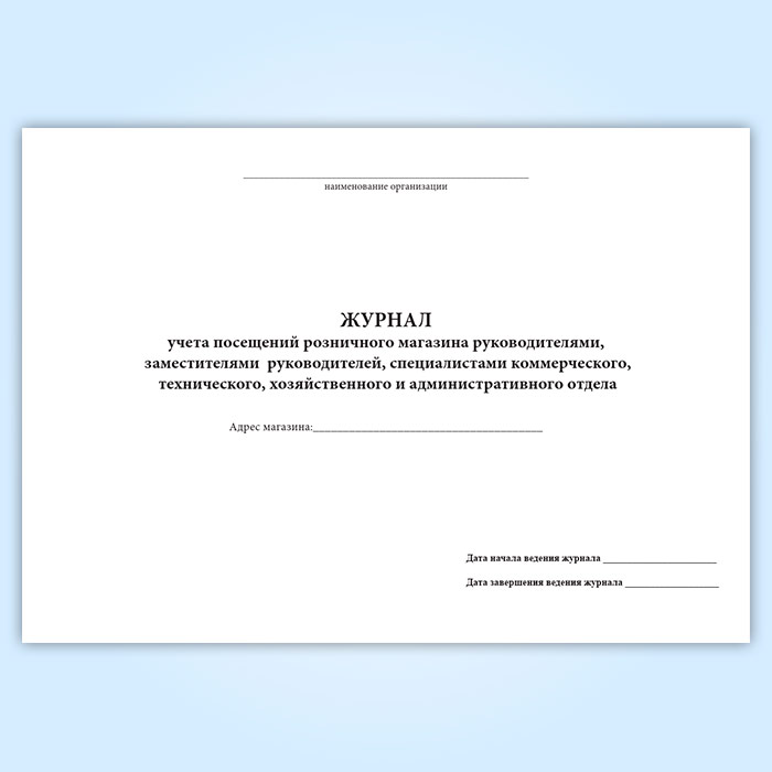 В розничных магазинах для учета посещений торговой точки руководителями, заместителями руководителей, специалистами коммерческого, технического, хозяйственного и административного отдела используют журнал, в котором фиксируют дату, цель посещения магазина ответственным лицом с обязательным указанием Ф.И.О. и должности.