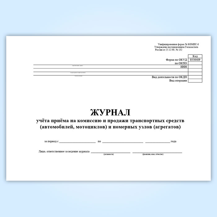 Журнал учета приема на комиссию и продажи транспортных средств (автомобилей, мотоциклов) и номерных узлов (агрегатов) (Форма № КОМИС-8) соответствует Постановлению Госкомстата РФ от 25.12.1998 № 132 " Об утверждении унифицированных форм первичной учетной документации по учету торговых операций".