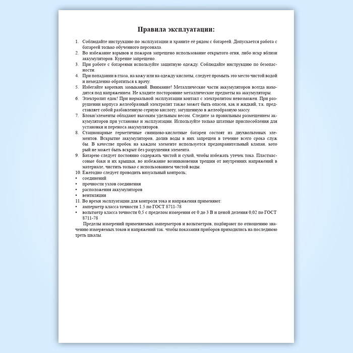 9. Батарею следует постоянно содержать чистой и сухой, чтобы избежать утечек тока. Пластмассовые баки и их крышки, во избежание возникновения трещин от внутренних напряжений в материале, чистить только с использованием чистой воды.