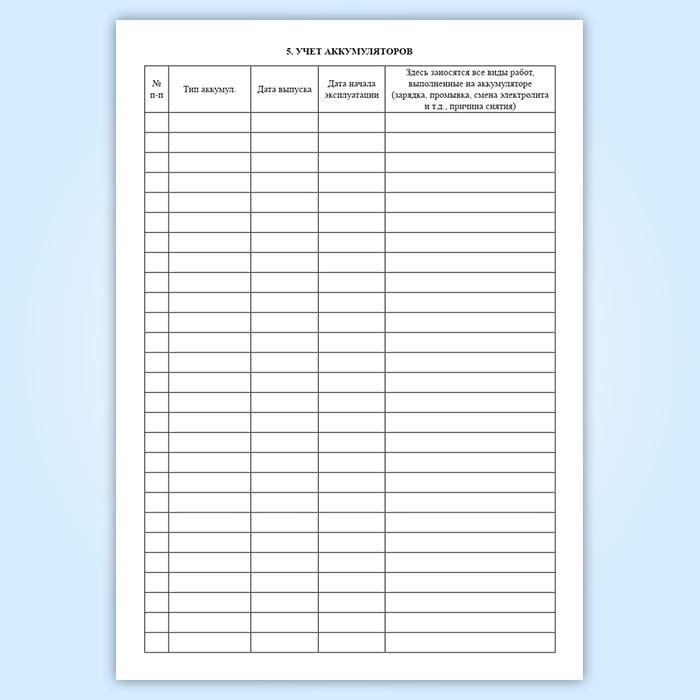 Здесь заносятся все виды работ, выполненные на аккумуляторе (зарядка, промывка, смена электролита и т.д., причина снятия)