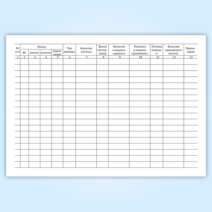 Форма журнала учета материалов объективного контроля, поступающих на обработку в лабораторию объективного контроля соответствует Приложению №6 к Приказу Министра обороны РФ от 17.10.2001 N 420 " Об утверждении Федеральных авиационных правил по организации объективного контроля в государственной авиации"