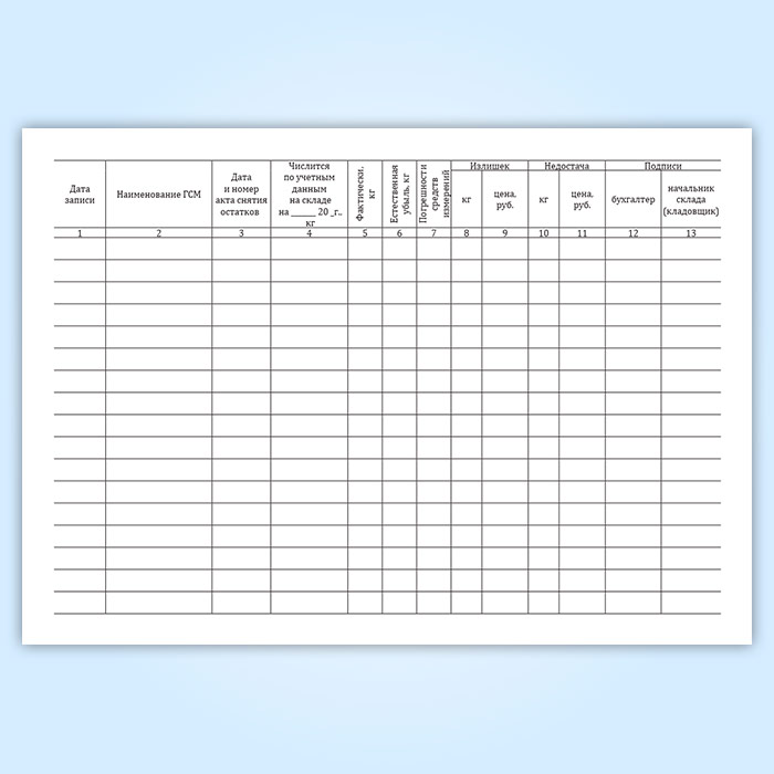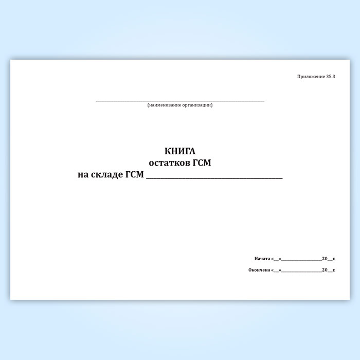 Форма книги остатков ГСМ на складе ГСМ соответствует Приложению №35.3 к Инструкции о порядке ведения учета, отчетности и расходования горюче-смазочных материалов в гражданской авиации