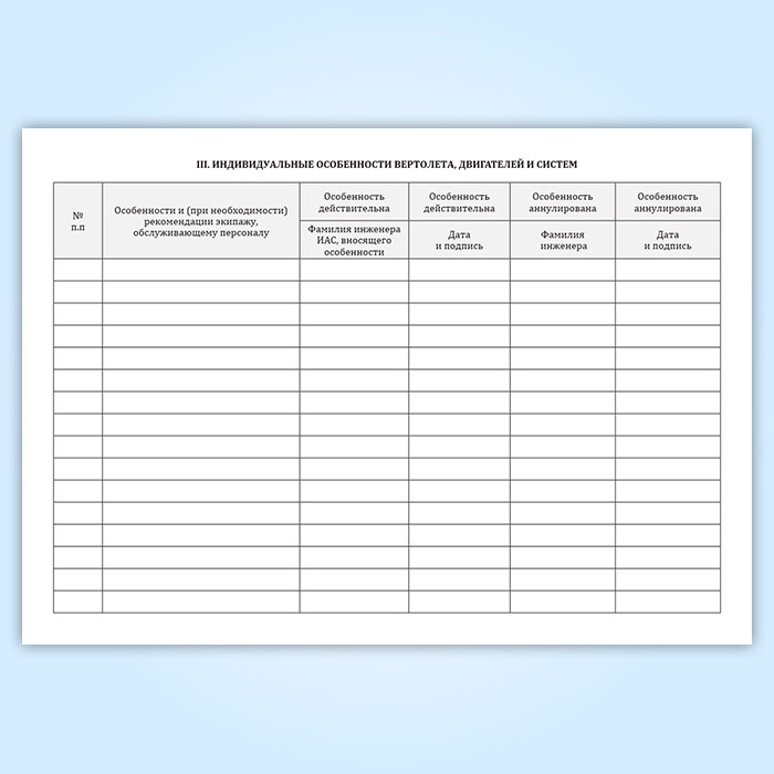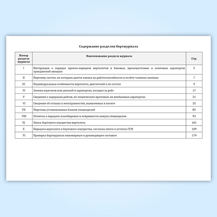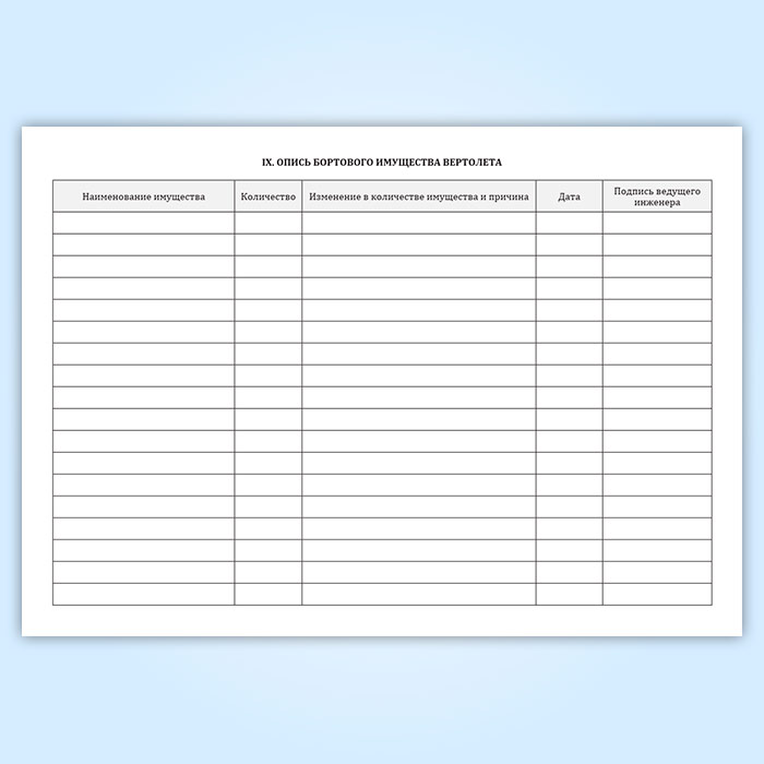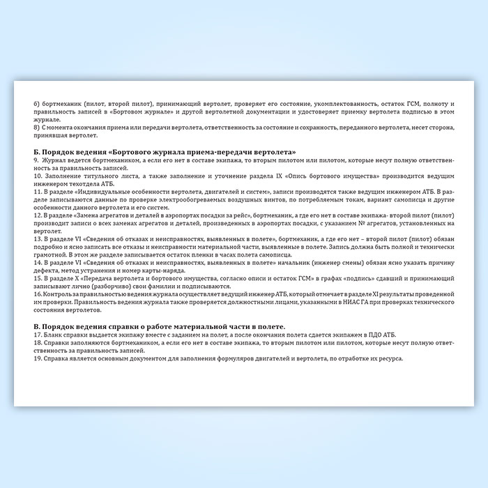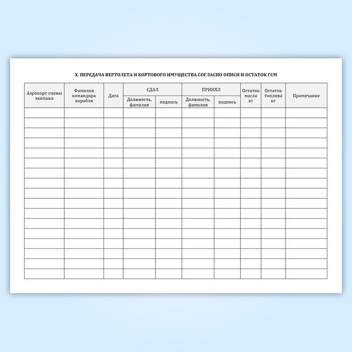 Состояние всех систем и агрегатов вертолета, их технические особенности, возникшие неисправности, а также бортовое имущество судна и сведения о вылетах отражается в бортовом журнале вертолета.