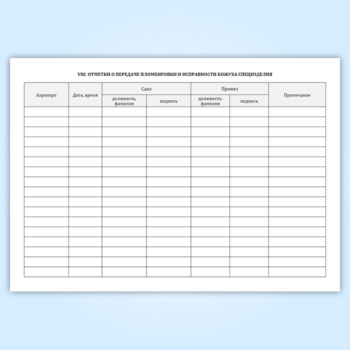 VIII Отметки о передаче пломбировки и исправности кожуха специзделия