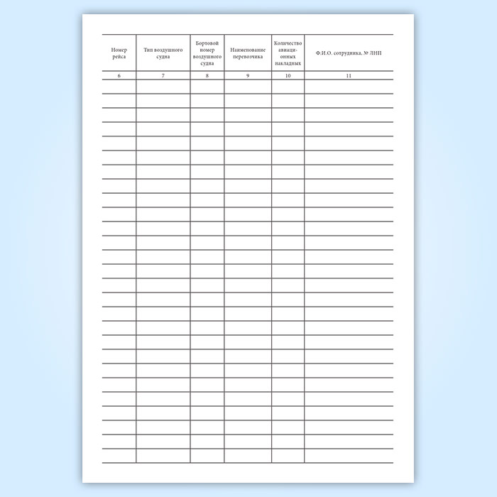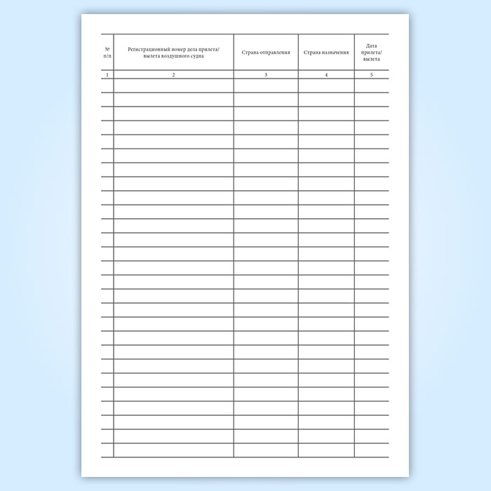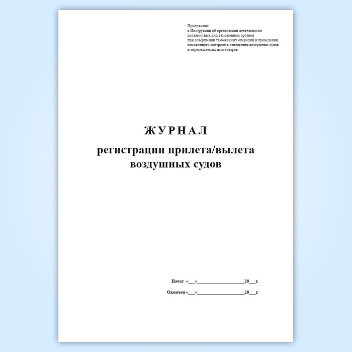 Форма журнала соответствует Приложению к Инструкции об организации деятельности должностных лиц таможенных органов при совершении таможенных операций и проведении таможенного контроля в отношении воздушных судов и перемещаемых ими товаров.