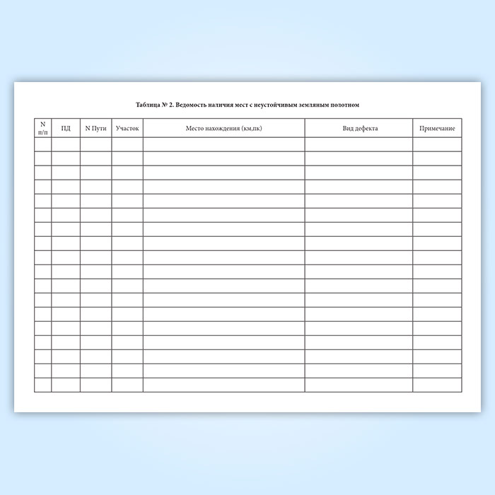 Таблица № 2. "Ведомость наличия мест с неустойчивым земляным полотном" содержит графы: