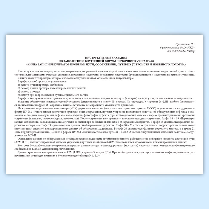 Форма книги записи результатов проверки пути, сооружений, путевых устройств и земляного полотна, ПУ-28 соответствует Приложению № 1 к Распоряжению ОАО " РЖД" от 25.04.2012 г. N 824р " О ведении в опытную эксплуатацию электронных внутренних форм первичного учета ОАО " РЖД" ПУ-28, ПУ-29 в путевом хозяйстве" .