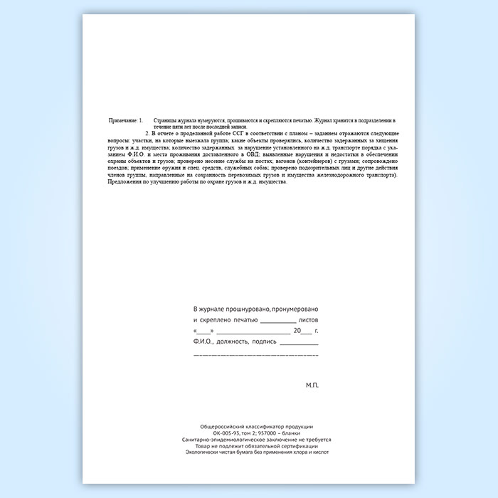 Страницы журнала необходимо нумеровать, прошивать и скреплять печатью. Журнал хранится в подразделении в течение пяти лет после последней записи.