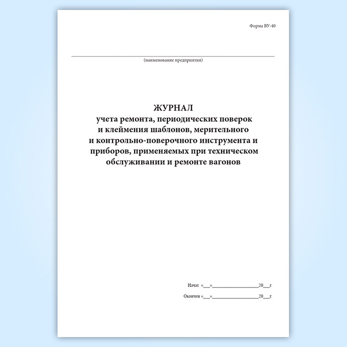 Журнал учета ремонта, периодических поверок и клеймения шаблонов, мерительного и контрольно-поверочного инструмента и приборов, применяемых при техническом обслуживании и ремонте вагонов (форма ВУ-40)