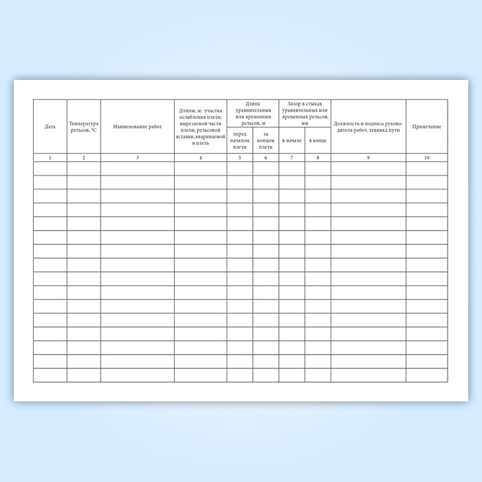 Журнал учета службы и температурного режима рельсовых плетей соответствует Приложению №2 к Инструкции по устройству, укладке, содержанию и ремонту бесстыкового пути.