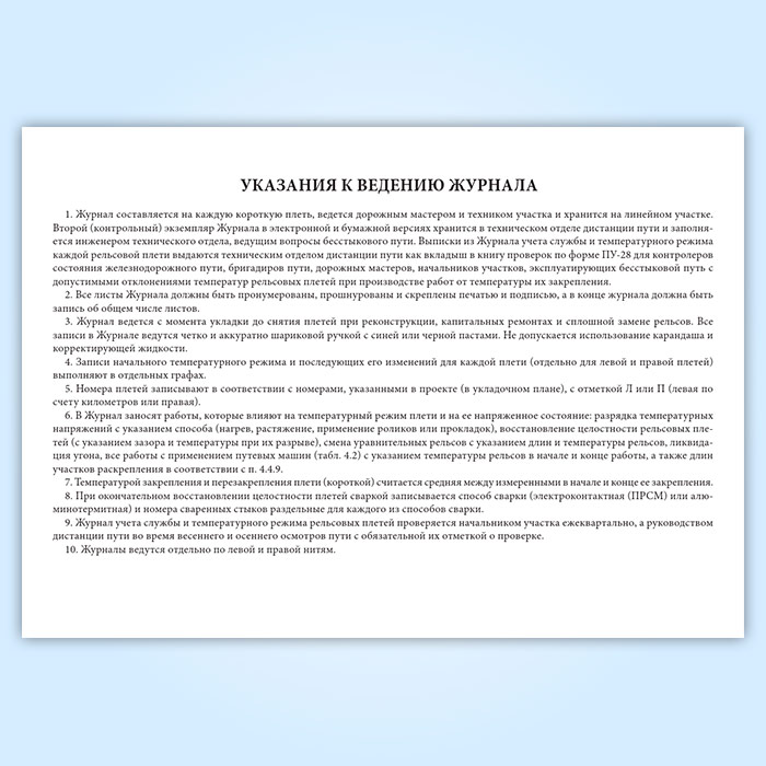 1. Журнал составляется на каждую короткую плеть, ведется дорожным мастером и техником участка и хранится на линейном участке. Второй (контрольный) экземпляр Журнала в электронной и бумажной версиях хранится в техническом отделе дистанции пути и заполняется инженером технического отдела, ведущим вопросы бесстыкового пути. Выписки из Журнала учета службы и температурного режима каждой рельсовой плети выдаются техническим отделом дистанции пути как вкладыш в книгу проверок по форме ПУ-28 для контролеров состояния железнодорожного пути, бригадиров пути, дорожных мастеров, начальников участков, эксплуатирующих бесстыковой путь с допустимыми отклонениями температур рельсовых плетей при производстве работ от температуры их закрепления.