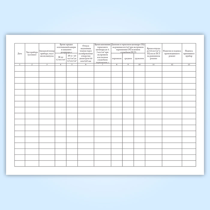 в графах 5, 6, 7 указываются данные зарядки камер золотниковой (ЗК), рабочей (РК) и запасного резервуара (ЗР). В гр. 6 данные зарядки рабочей камеры записываются дробью: в числителе - зарядка до 1,2 кгс/см2; в знаменателе - до 4,6 кгс/см2;