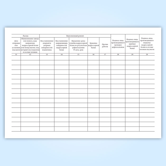 В случае отправки неисправной надрессорной балки в другой пункт для ремонта по строке этих граф (гр. 11 - 18) записывается "Отправлена в ремонт". Если ремонт надрессорной балке не производился, делается отметка "Ремонт не производился".