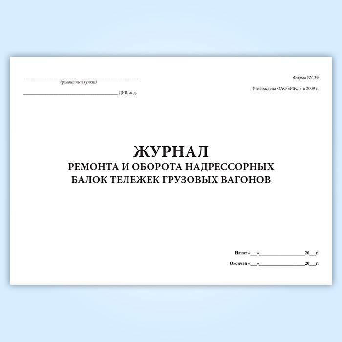 Форма журнала ремонта и оборота надрессорных балок тележек грузовых вагонов ВУ-39 утверждена Распоряжением ОАО " РЖД" от 13 января 2009 г. №34р " Об утверждении форм первичной документации"