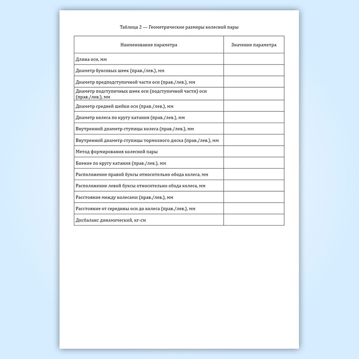 Форма паспорта на колесную пару соответствует Приложению Ж к ГОСТу 4835-2013 Колесные пары железнодорожных вагонов. Технические условия