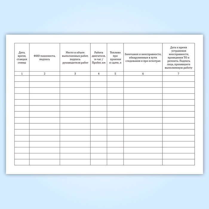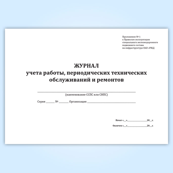Форма журнала учета работы, периодических технических обслуживаний и ремонта соответствует Приложению №1 к Распоряжению ОАО "РЖД" от 26.12.2016 № 2676р "Об утверждении и введении в действие Правил эксплуатации специального железнодорожного подвижного состава на инфраструктуре ОАО "РЖД"