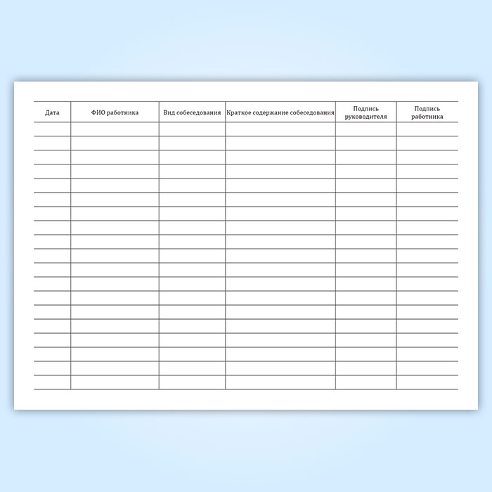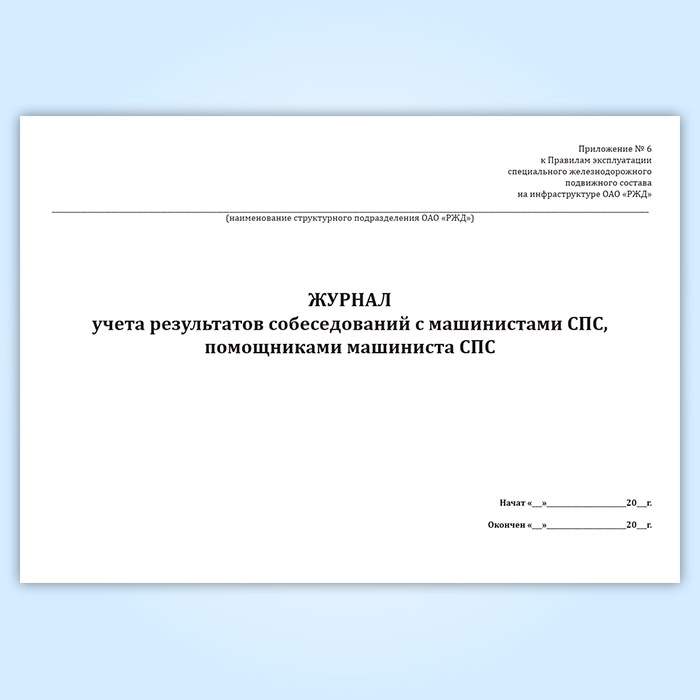Форма журнала учета результатов собеседований с машинистами СПС, помощниками машиниста СПС соответствует приложению №6 к Распоряжению ОАО "РЖД" № 2676р "Об утверждении и введении в действие Правил эксплуатации специального железнодорожного подвижного состава на инфраструктуре ОАО "РЖД" от 26.12.2016 года.