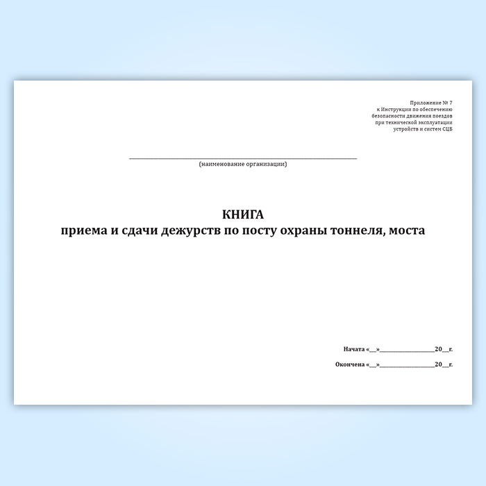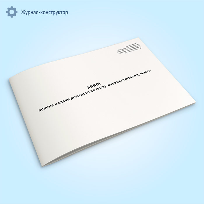 Форма книги приема и сдачи дежурств по посту охраны тоннеля, моста соответствует Приложению №7 к ЦШ-530-11 «Инструкция по обеспечению безопасности движения поездов при технической эксплуатации устройств и систем СЦБ», которая была утверждена распоряжением ОАО "РЖД" № 2055р от 20 сентября 2011 года.
