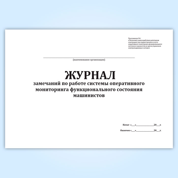 Форма журнала замечаний по работе системы оперативного мониторинга функционального состояния машинистов соответствует Приложению №1 к Регламенту взаимодействия работников электродепо при предоставлении услуги оперативного мониторинга функционального состояния машинистов во время управления электроподвижным составом
