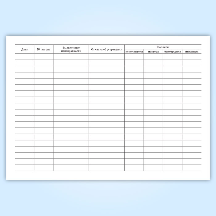 Неисправности, выявленные при осмотре подвижного состава, фиксируют в журнале с указанием № вагона и подписью осмотрщика.