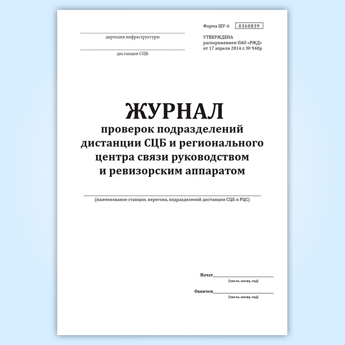 Форма Журнала проверок подразделений дистанции СЦБ и регионального центра связи руководством и ревизорским аппаратом (ШУ-6) приведена в Альбоме форм внутреннего первичного учета ОАО " РЖД" в хозяйстве автоматики и телемеханики