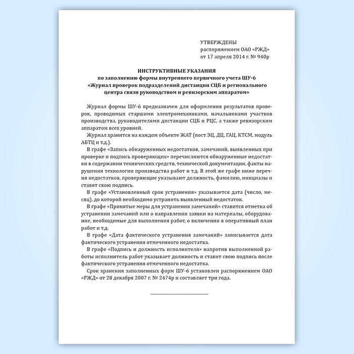 Журнал формы ШУ-6 предназначен для оформления результатов проверок, проводимых старшими электромеханиками, начальниками участков производства, руководителями дистанции СЦБ и РЦС, а также ревизорским аппаратом всех уровней.