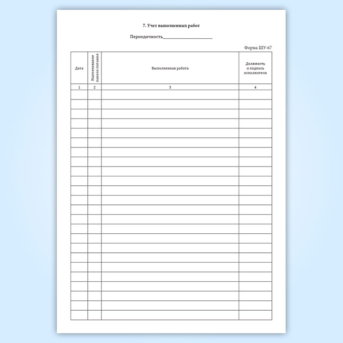 Разделы журнала технической проверки установки электропитания (Форма ШУ-67):