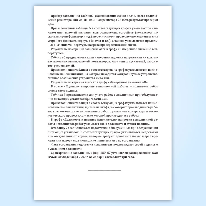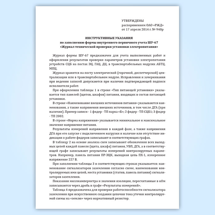 Журнал формы ШУ-67 предназначен для учета выполненных работ и оформления результатов проверки параметров установки электропитания устройств СЦБ на постах ЭЦ, ГАЦ, ДЦ, в транспортабельных модулях АБТЦ, МПЦ.