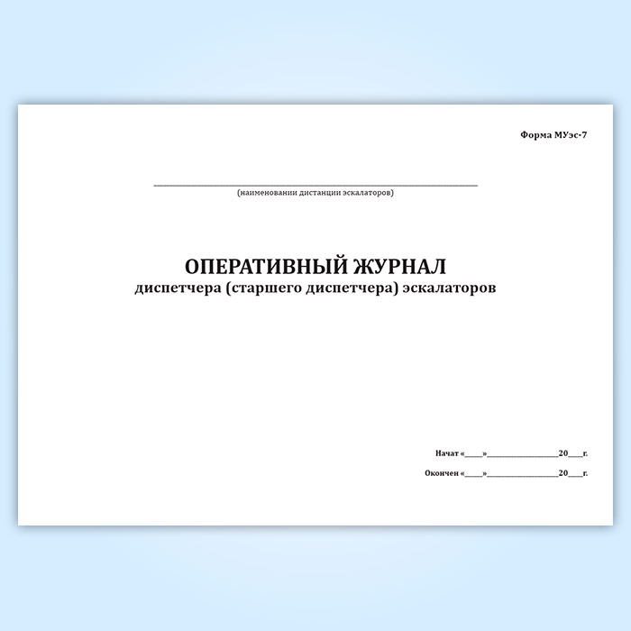 Оперативный журнал диспетчера (старшего диспетчера) эскалаторов (Форма МУэс-7) предназначен для регистрации приказов и распоряжений, которые диспетчер отдает оперативно-ремонтному персоналу эскалаторов станций (лицу, принявшему смену), ответственному дежурному по дистанции. Работникам скорой технической помощи отдает распоряжение старший диспетчер. В журнале также регистрируются сообщения работников Эскалаторной службы ДИ обо всех нарушениях в работе эскалаторов станций (эскалатор, связь, вентиляция, телемеханика, напряжение и т.д.). Записи в журнал вносятся в течение смены диспетчером (старшим диспетчером) на диспетчерском участке.