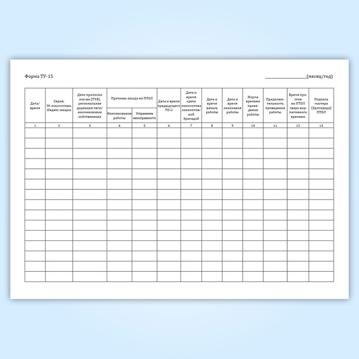 Книга формы ТУ-15 предназначена для учета случаев захода локомотивов в пункты технического обслуживания локомотивов для производства технического обслуживания ТО-2, экипировки или постановки локомотива для устранения неисправностей, возникших в процессе эксплуатации. Книга формы ТУ-15 заполняется мастером ПТОЛ при производстве ТО-2 или экипировки локомотивов.