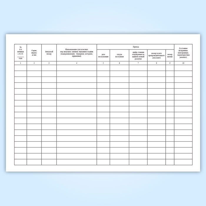 Книга учета наличия и состояния технологического запаса основных узлов и запасных частей локомотивов, моторвагонного подвижного состава (Форма ТУ-20) имеет графы: