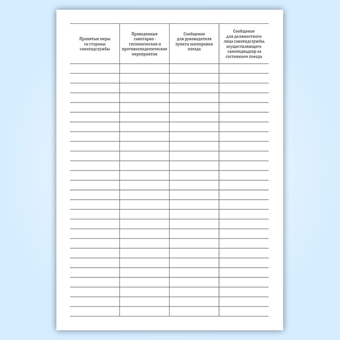 В целях контроля проведения санитарно-гигиенических и противоэпидемических мероприятий на территории вагонов поездов, ответственное лицо ведет специальный журнал.