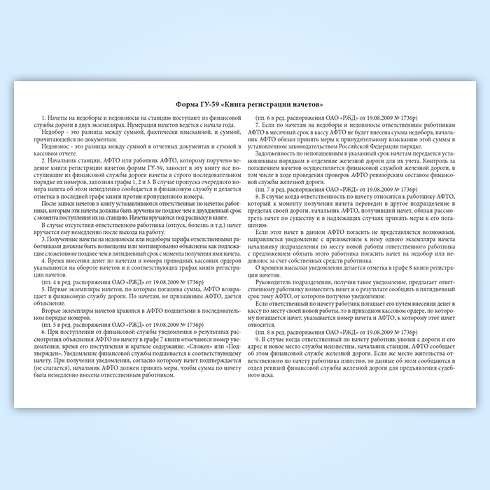 Начальник станции, АФТО или работник АФТО, которому поручено ведение книги регистрации начетов формы ГУ-59, заносит в эту книгу все поступившие из финансовой службы дороги начеты в строго последовательном порядке их номеров, заполняя графы 1, 2 и 3. В случае пропуска очередного номера начета об этом немедленно сообщается в финансовую службу и делается отметка в последней графе книги против пропущенного номера.