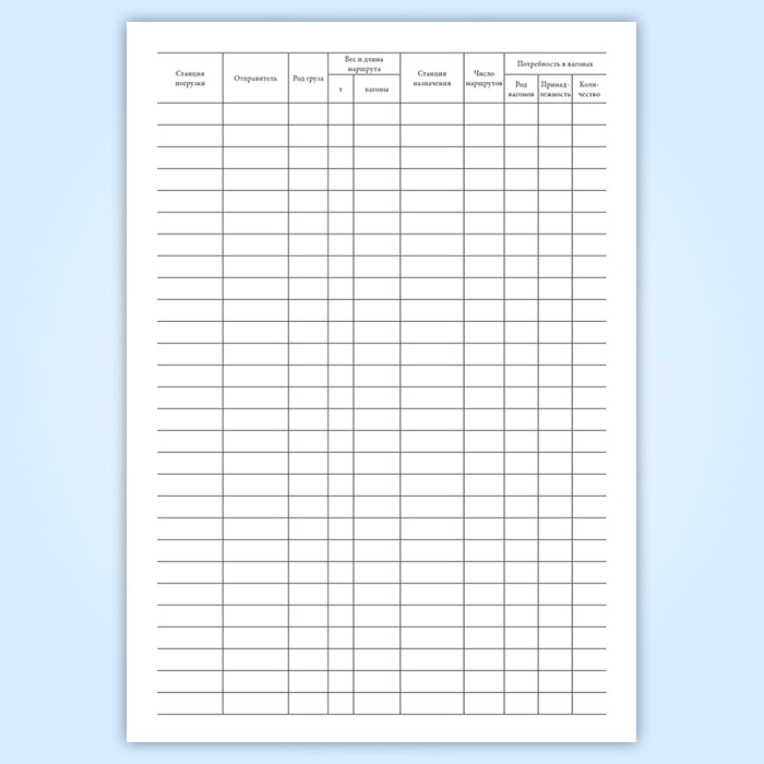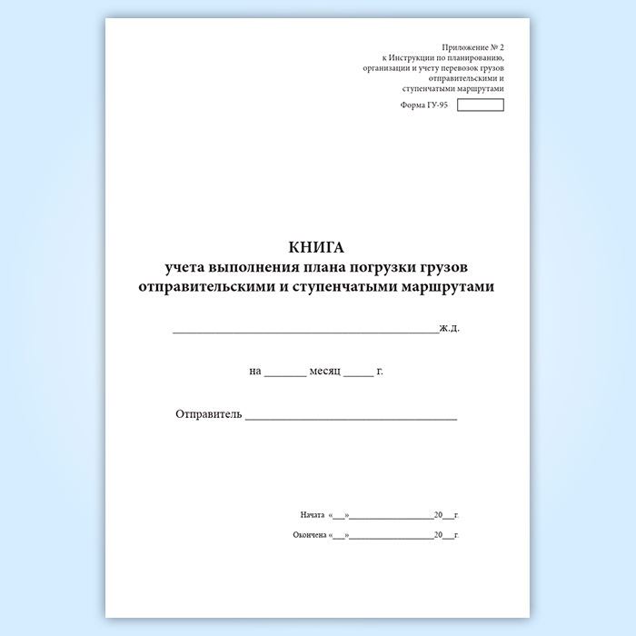 Форма книги учета выполнения плана погрузки грузов отправительскими и ступенчатыми маршрутами (ГУ-95) соответствует Приложению № 2 к Инструкции по планированию, организации и учету перевозок грузов отправительскими и ступенчатыми маршрутами, которая утратила силу.