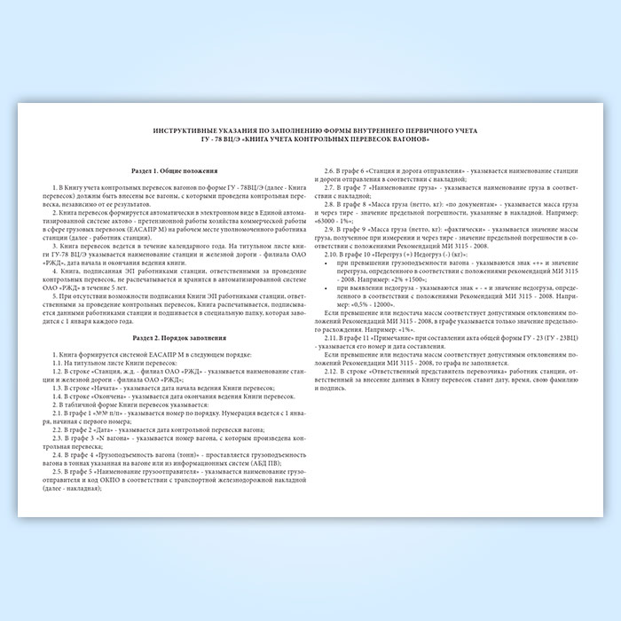 Форма книги учета контрольных перевесок вагонов (ГУ-78 ВЦ/Э) утверждена распоряжением ОАО «РЖД» от 28.03.2018 г. № 635/р