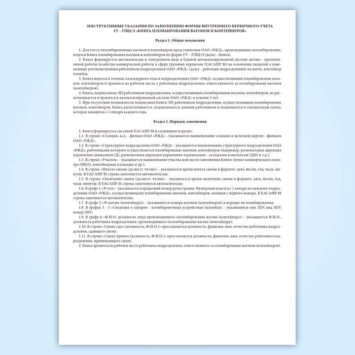 Книга пломбирования вагонов и контейнеров (ГУ-37ВЦ/Э) утверждена распоряжением ОАО «РЖД» от 28.03.2018 г. № 635/р