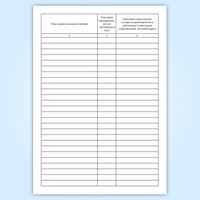 в графу 5 - участники проводимого мероприятия. Например: мастера участков по ремонту железнодорожного подвижного состава, проводники пассажирских вагонов, уполномоченные по охране труда, другие руководители, специалисты, работники структурного подразделения железной дороги. В этой же графе указывается общее количество участников мероприятия, слушателей лекции, работников, участвующих в просмотре видеофильмов, и другое;