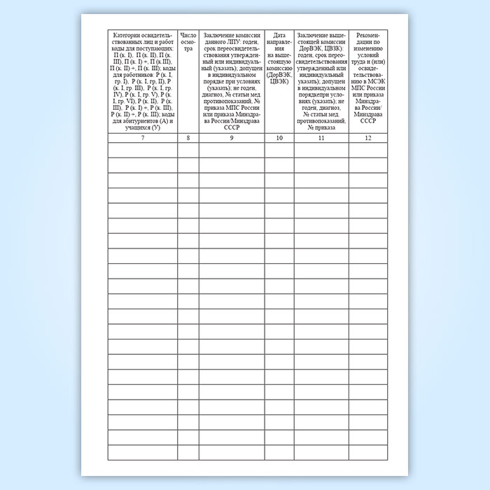 В графах 9,11, и 12 регистрируются заключения и рекомендации врачебно-экспертных комиссий. В графе 9 особо выделяются заключения "не годен" (по всем статьям медицинских противопоказаний) к работе или обучению по профессии (специальности), для которой требуется проведение обязательных медицинских осмотров.