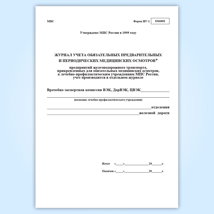 Форма журнала учета обязательных предварительных и периодических медицинских осмотров (НУ-1) соответствует Приложению 6 к Указанию О медицинских регламентах допуска к работам, непосредственно связанным с движением поездов, и деятельности врачебно-экспертных комиссий лечебно-профилактических учреждений федерального железнодорожного транспорта. Л-2257у