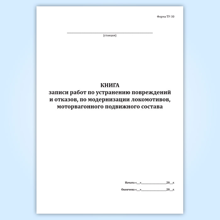 Форма Книги записи работ по устранению повреждений и отказов, по модернизации локомотивов, моторвагонного подвижного состава (Форма ТУ-30) соответствует Инструктивным указаниям о порядке составления учетных форм по локомотивному хозяйству. МПС РФ, № ЦЧУЛ-68 от 30.09.1999.