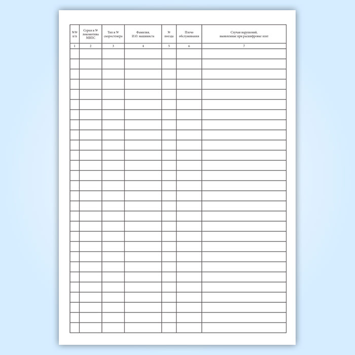 Графы 1-7 журнала заполняются расшифровщиком скоростемерных лент, в которых указываются все нарушения, обнаруженные при расшифровке скоростемерной ленты.