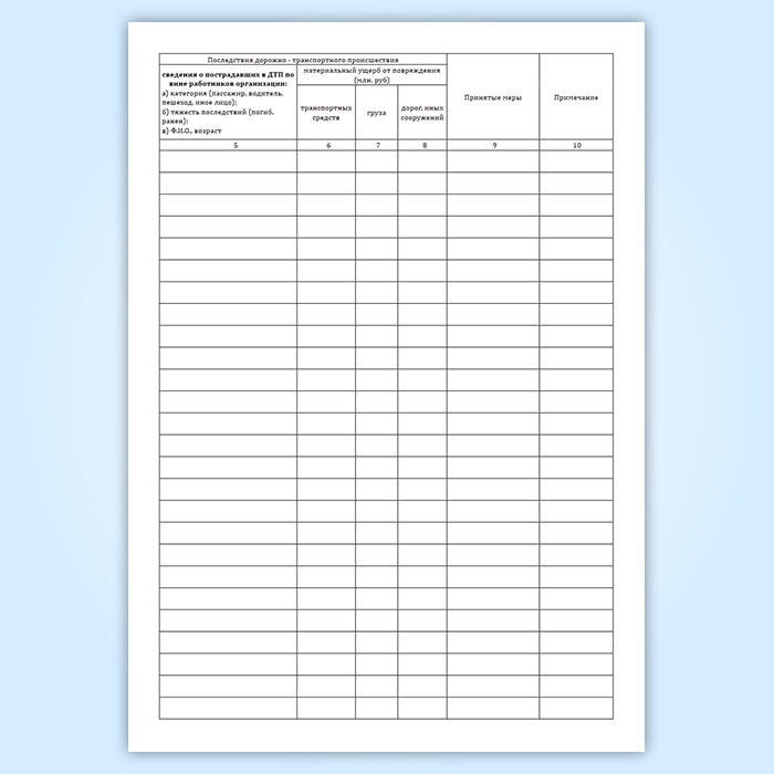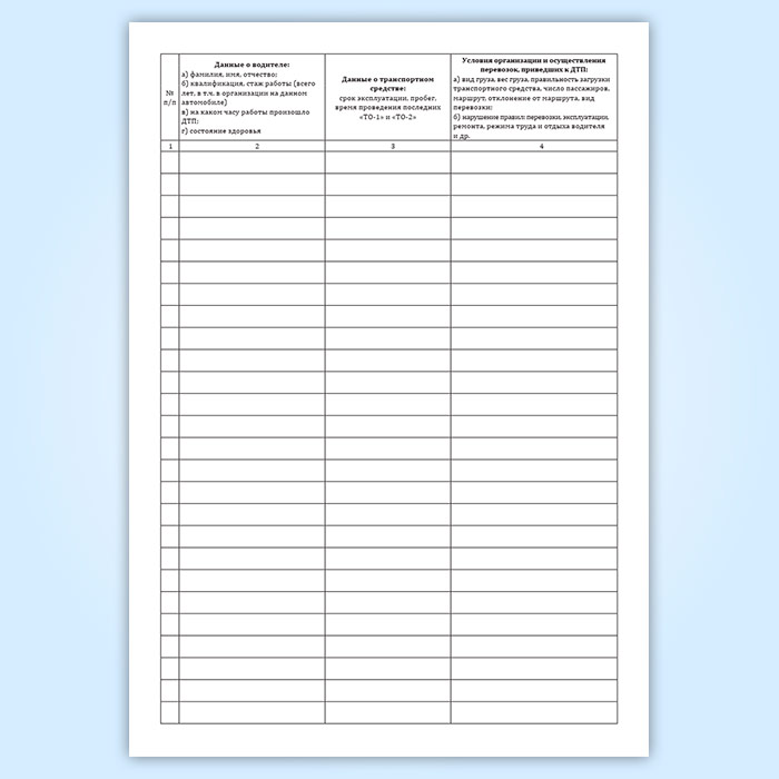Форма журнала соответствует Приложению (Раздел 2) к Приказу Минтранса РФ от 02.04.1996 N 22 «О Форме учета дорожно-транспортных происшествий владельцами транспортных средств».