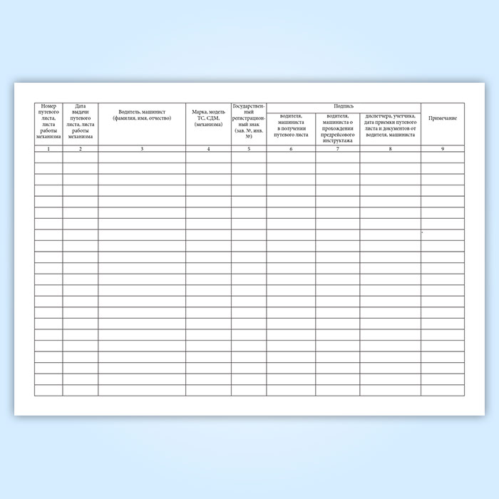 См. также Журнал учета движения путевых листов (Форма №8), графы которого отличаются, а форма утверждена постановлением Госкомстата РФ от 28.11.1997 № 78 " Об утверждении унифицированных форм первичной учетной документации по учету работы строительных машин и механизмов, работ в автомобильном транспорте"